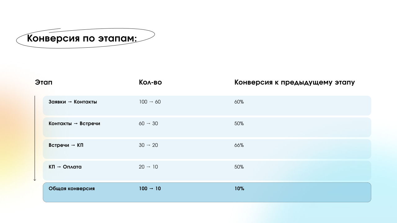 Такая таблица покажет: например, если от 60 контактов до 30 встреч — это 50%, а до КП — только 66%, возможно, презентация продукта «проседает».