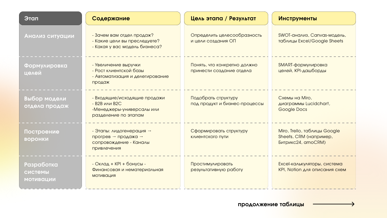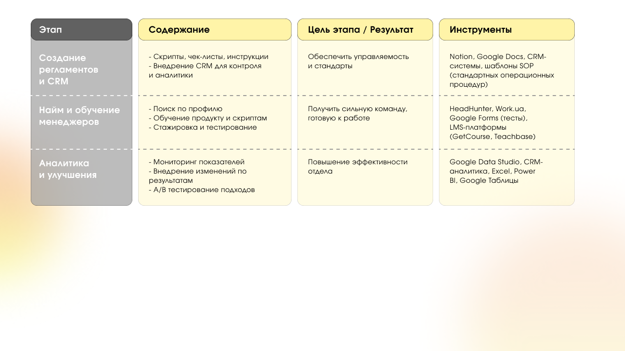 - формализовать процессы: от входа лида до постпродажного сопровождения;