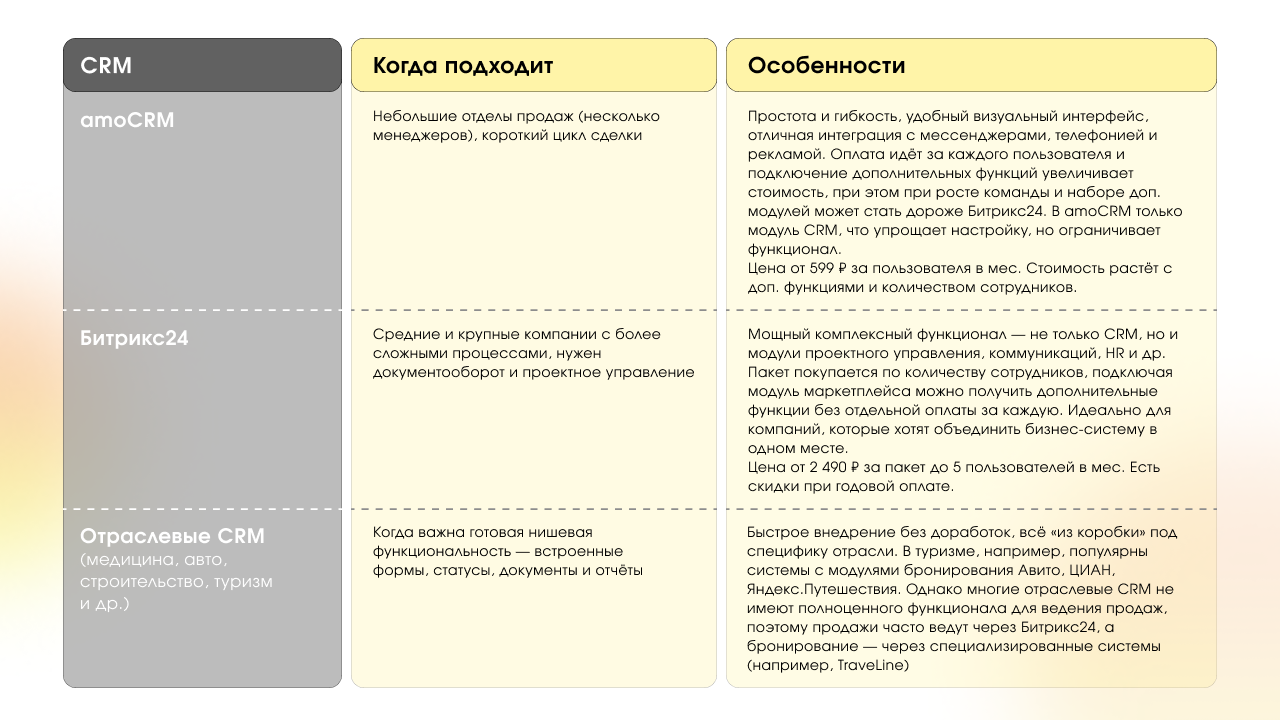 CRM — это не просто «таблица с клиентами». Это:- учёт и история каждого контакта;