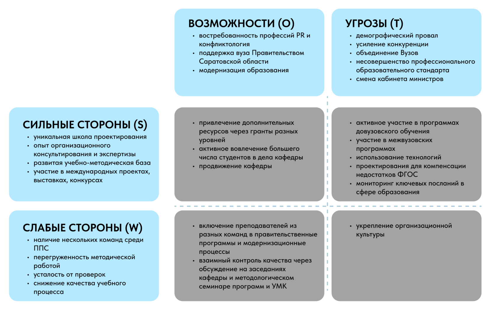- Использование возможностей для расширения рынка или внедрения новых продуктов;
